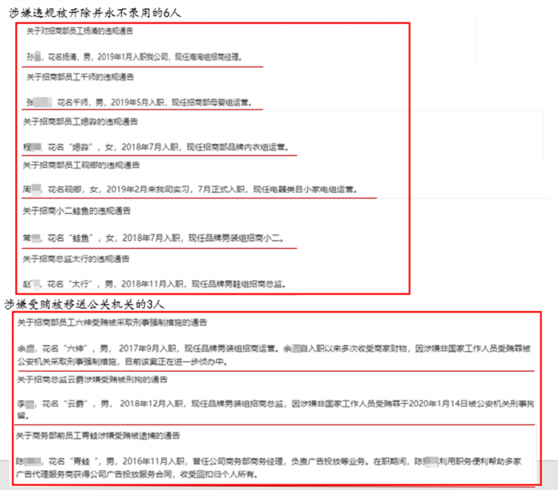 今年3月6日,拼多多商家后台同步了招商小二云蔚涉嫌收受商家贿赂被检察院批准逮捕,招商经理六神多次收受商家贿赂被公安机关采取刑事强制措施的公告。