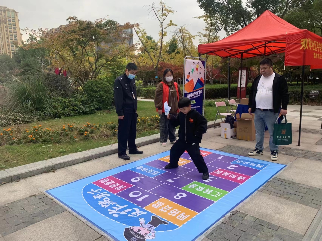 近日,温州市公安局龙湾区分局中心区派出所社区民警黄温伟带领警务助理,在龙翔湖公园“摆摊”开展反诈宣传,还特别通过反诈跳卡游戏,寓教于乐地向居民们传授防骗知识,提高大家的防范意识和能力。(通讯员 王泽 摄)